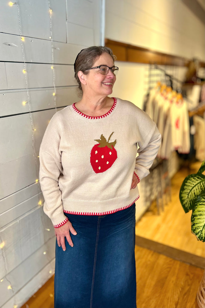 Bright, playful, and full of charm, the Strawberry Pullover is a cozy statement piece that adds joy to your everyday wardrobe. Featuring a bold strawberry knit design on a soft cream base, this pullover brings a lighthearted touch while remaining modest and easy to style.