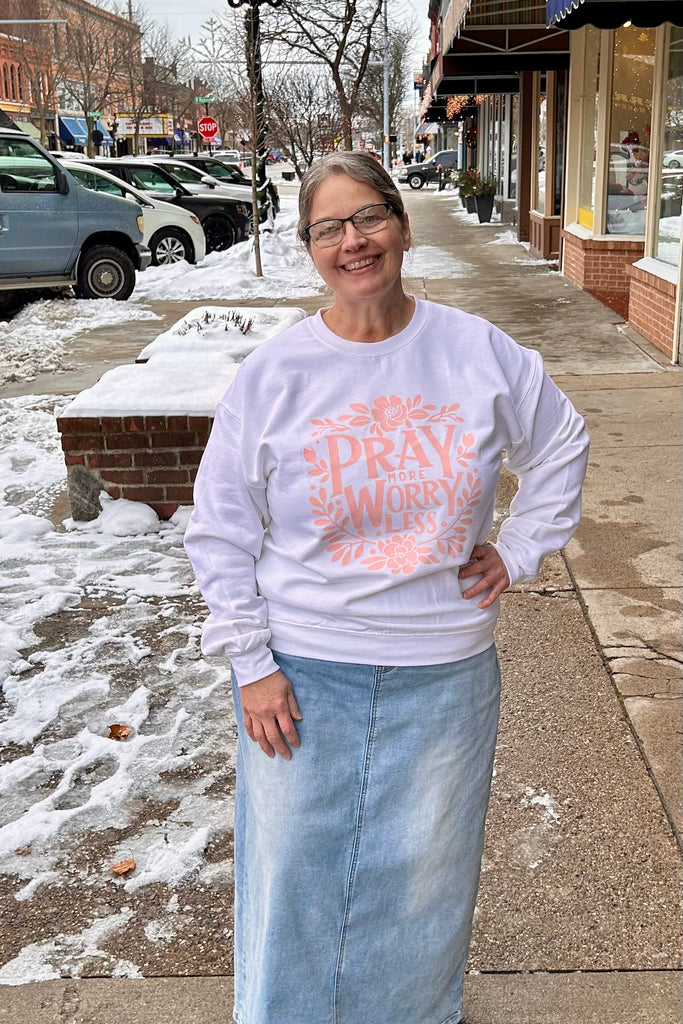 The Pray More, Worry Less sweatshirt is a gentle reminder to place our trust where it belongs. Designed with a soft floral graphic and comforting words, this sweatshirt encourages a posture of prayer over anxiety—day by day, moment by moment.