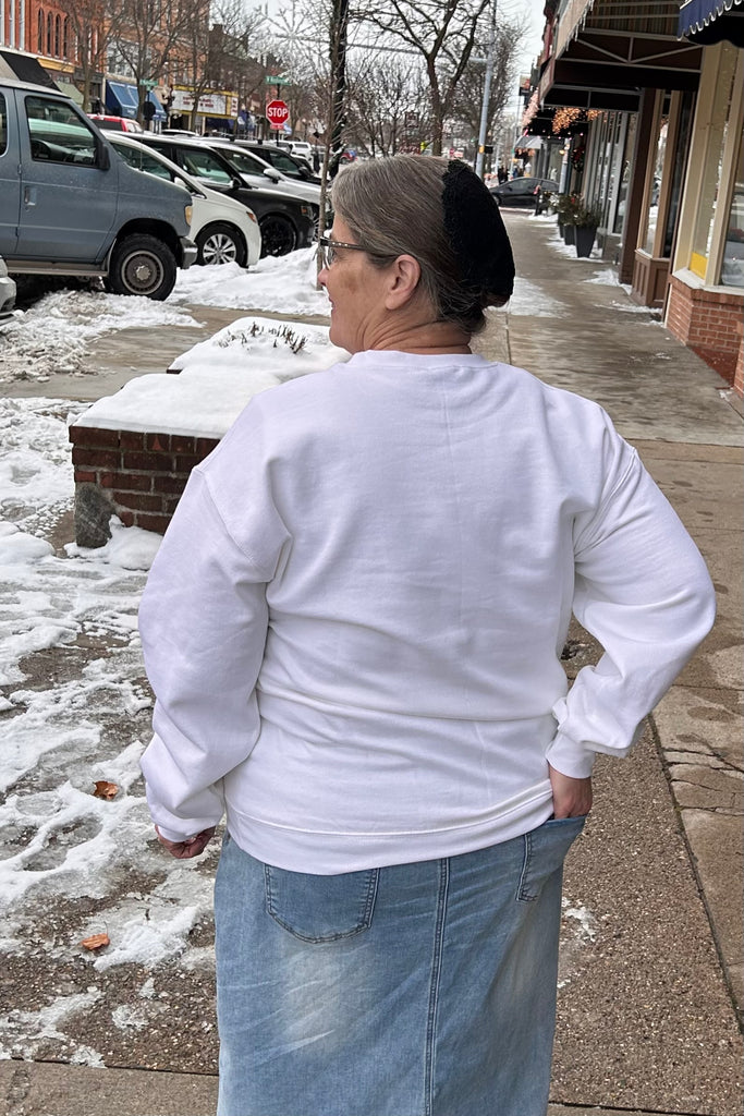 Woman wearing a white sweatshirt with a pink design and text, standing on a snowy sidewalk.