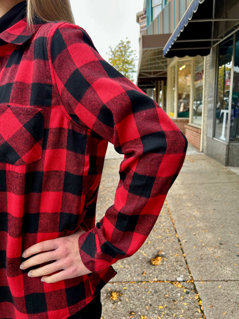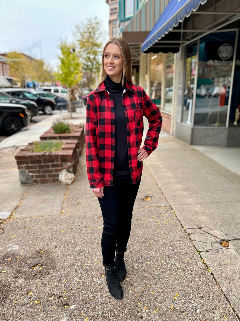 Cozy meets classic in our Sherpa Lined Flannel. This timeless red-and-black buffalo check is lined with soft sherpa, offering extra warmth without sacrificing style. Designed with a relaxed fit and button-front closure, it’s perfect for layering over your favorite tees, turtlenecks, or sweaters. Whether you’re strolling through town or heading out for a crisp fall adventure, this flannel brings comfort and effortless style together.