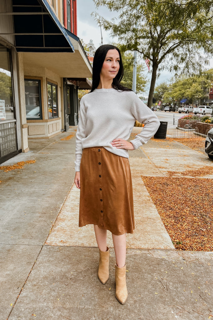 Fit is generous, Stay cozy and chic in the Nena Sweater—a soft knit that brings both comfort and style to your everyday. Designed in a beautiful brown hue with an easy, flattering silhouette, this sweater is one you’ll want on repeat all season long.