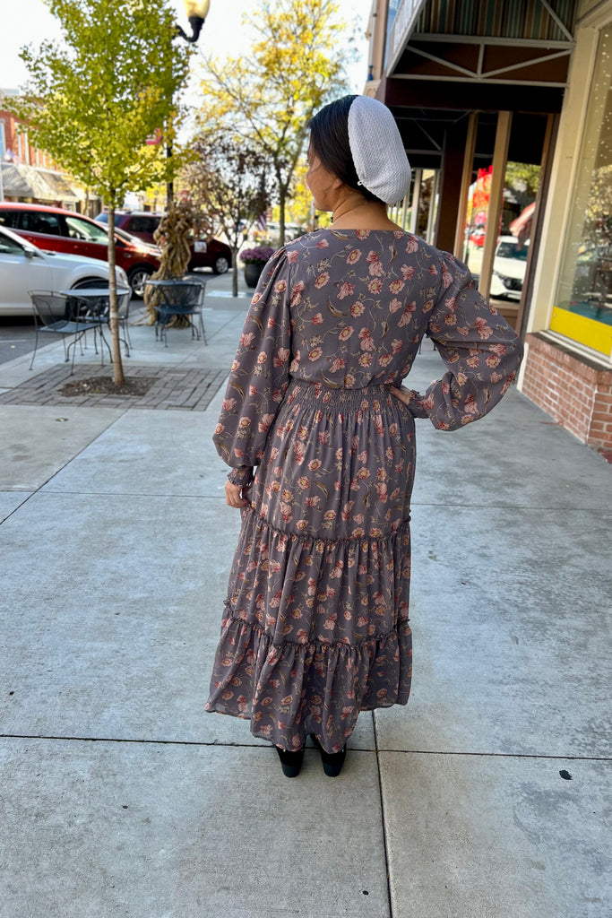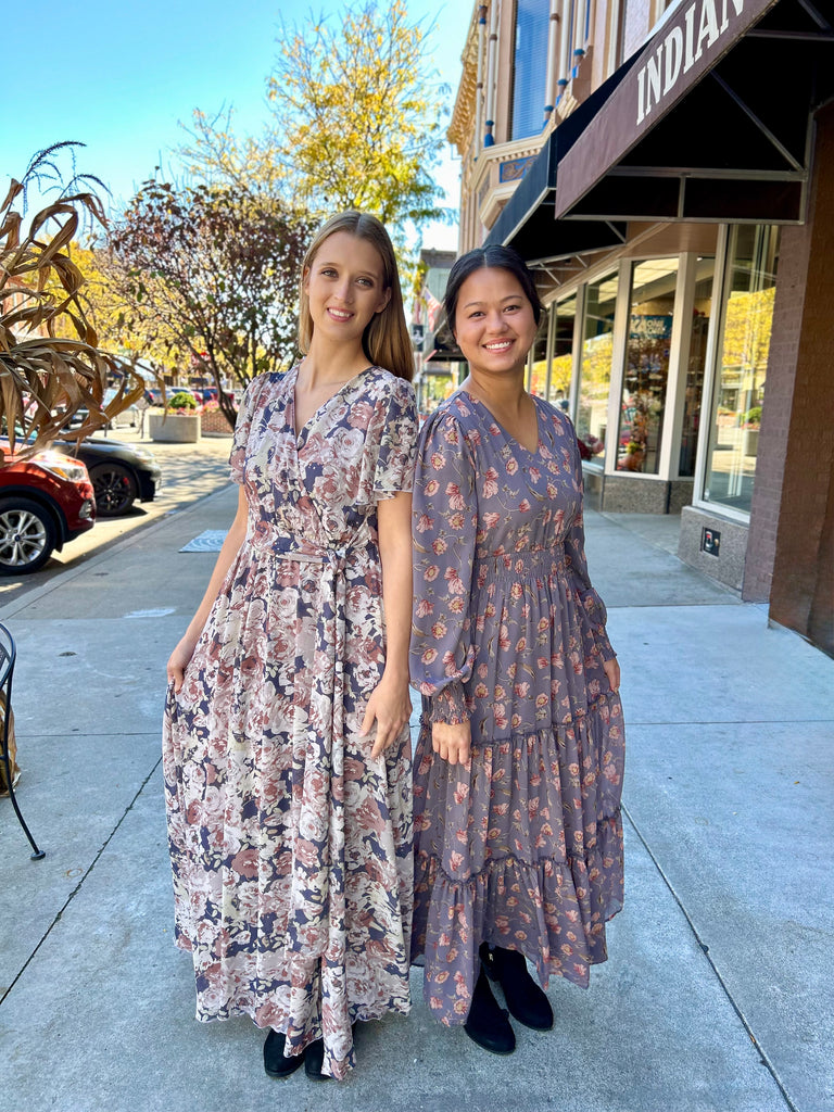Meet the Jacey Maxi Dress—a graceful blend of femininity and ease. Designed with a flattering smocked waist and cuffs, a soft V-neckline, and a tiered skirt that moves beautifully with every step. Long sleeves and side pockets make it as practical as it is pretty. Crafted from lightweight chiffon with a subtle floral print, this dress captures the gentle charm of fall while offering year-round wearability.